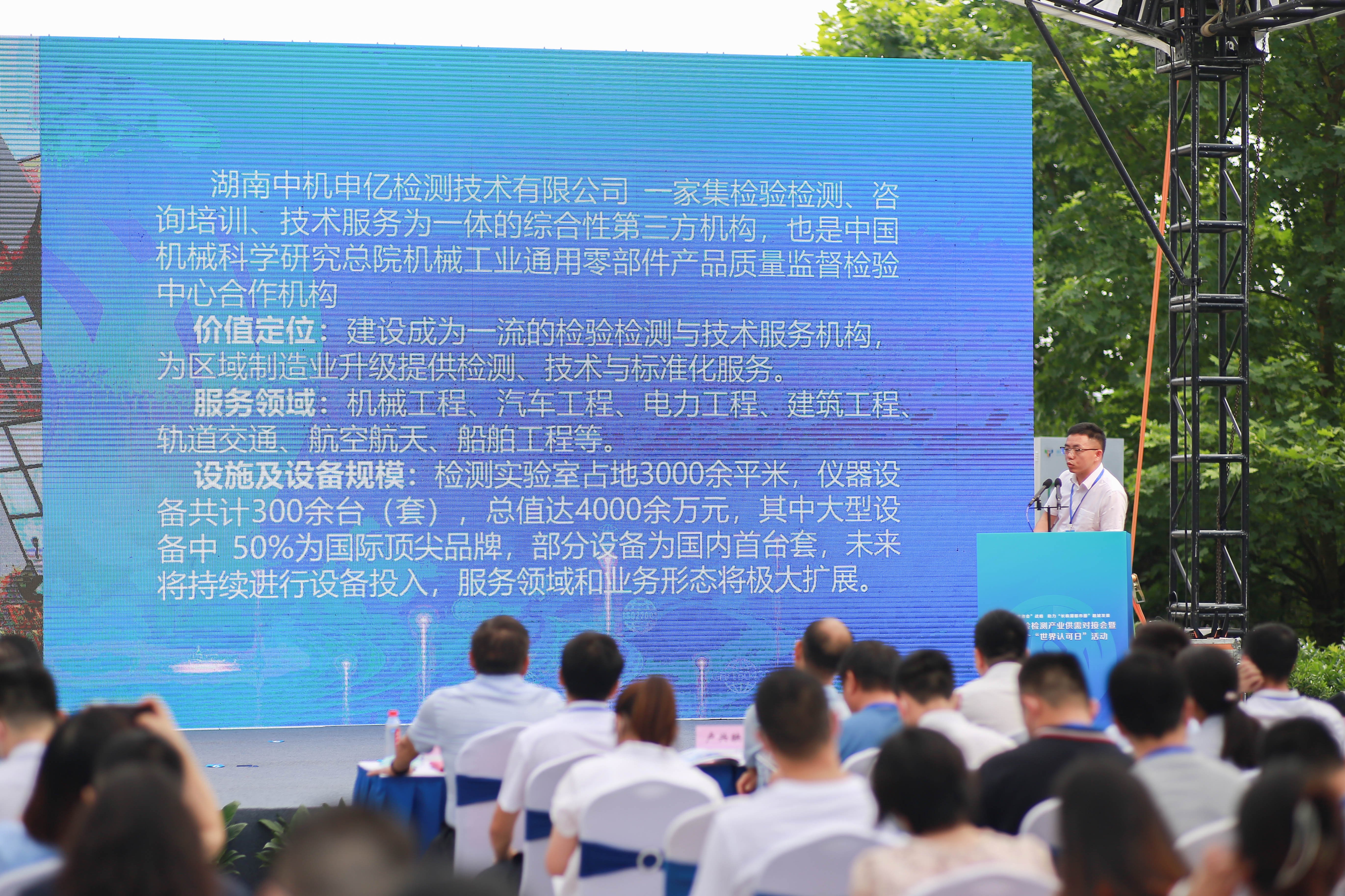 活動現(xiàn)場, 湖南中機申億檢測技術(shù)有限公司總經(jīng)理呂闖作為檢驗檢測機構(gòu)代表之一,上臺介紹了公司在檢驗檢測能力建設(shè)及公司未來發(fā)展的目標。湖南中機申億檢測技術(shù)有限公司將以市場為導向,優(yōu)化資源配置,堅持技術(shù)創(chuàng)新和制度創(chuàng)新,更快更高效的為客戶提供全方位的測試認證服務。